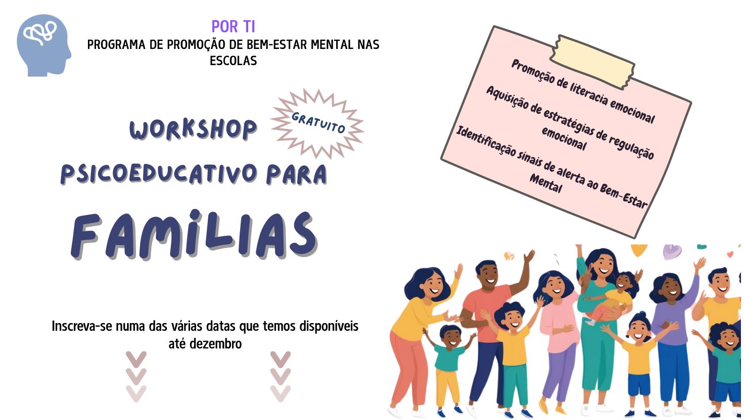 A Associação EPIS (Empresários pela Inclusão Social) vem, por este meio, convidá-lo a participar no Workshop Psicoeducativo para Famílias do POR TI - Programa de Promoção de Bem-estar Mental nas Escolas, que tem como objetivo o desenvolvimento de competências de regulação emocional que contribuam para estilos de vida mentalmente mais equilibrados.